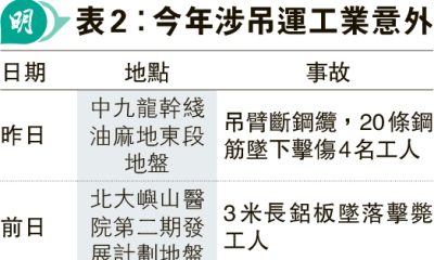 【明報專訊】翻查資料,今年發生至少9宗涉及吊運的工業...