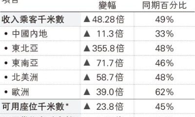 【明報專訊】國泰(0293)昨公布8月份客、貨運量數...