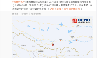 中國地震台網正式測定:3月8日下午4時50分,在西藏...
