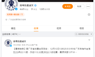 廣東地震局通報,據廣東省地震台網測定,12月13日下...