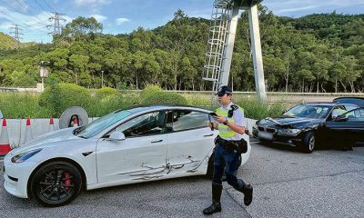 【明報專訊】兩輛私家車昨晨駛過大欖隧道收費亭後碰撞,...