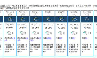 天文台表示,明日(14日)局部地區有驟雨,早上最低氣...