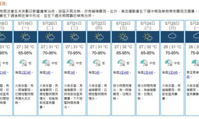 天文台表示,本港地區明日(21日)天氣預測大致多雲,...