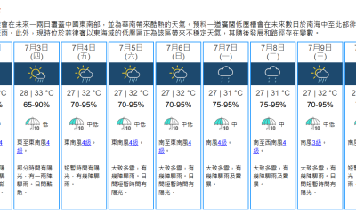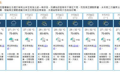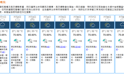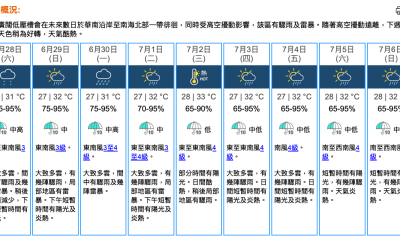 本港地區明日(6月30日)天氣預測:大致多雲,有幾陣...
