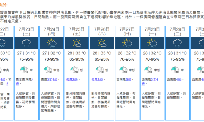 天文台表示,本港地區周四(7月31日)大致多雲,間中...