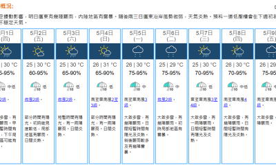 本港地區今晚(5月1日)及明日(5月2日)天氣預測:...
