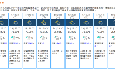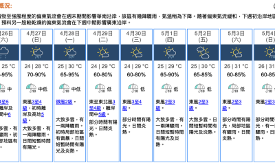 天文台預測,下周日(20日)早上有一兩陣驟雨及沿岸有...
