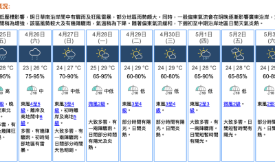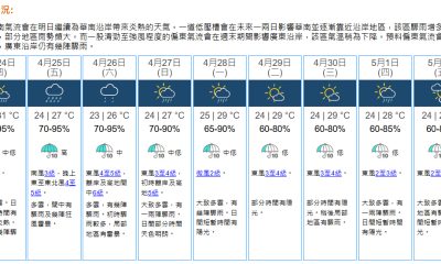 天文台表示,本港地區明日(25日)預測大致多雲,有驟...