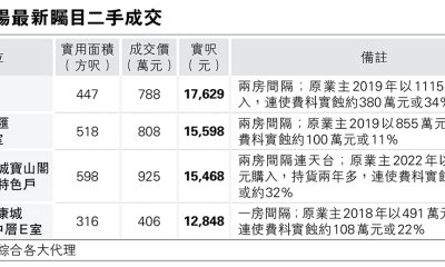 【明報專訊】雖然樓市氣氛不俗,但個別銀主盤成交價依然...
