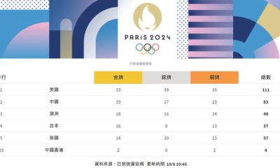 巴黎奧運將於香港時間周一(12日)閉幕,截至今日(1...