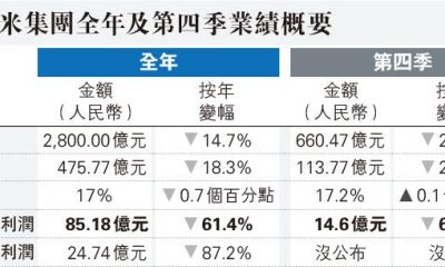 【明報專訊】小米集團(1810)昨日公布全年少賺87...