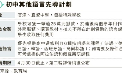 【明報專訊】教育局新推「初中其他語言先導計劃」,申請...