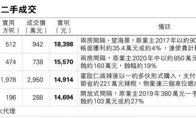 【明報專訊】市場聚焦新盤開售之際,二手物業市場不乏長...