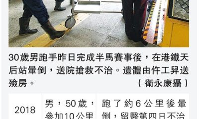 【19﹕00更新】香港馬拉松一名男跑手完成賽事後,於...