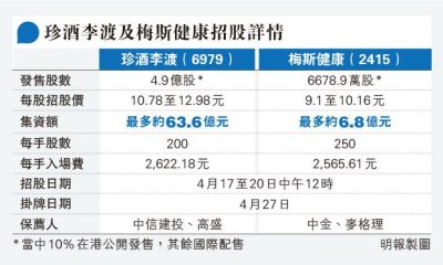 【明報專訊】新股珍酒李渡(6979)及梅斯健康(24...