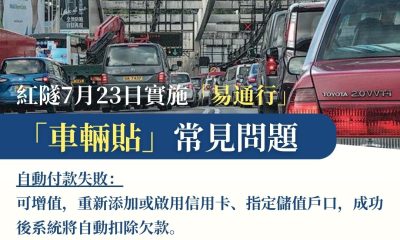 運輸署表示,紅隧自昨日(23日)上午5時起實施「易通...
