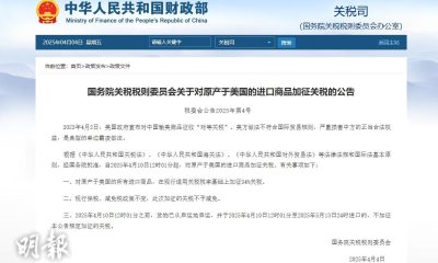 中國國務院關稅稅則委員會4月4日發布「關於對原產於美...