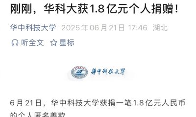 華中科技大學通報:「6月21日,華中科技大學獲捐一筆...