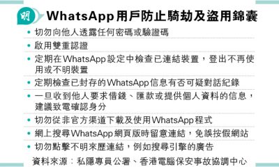 【明報專訊】WhatsApp部分帳戶近期疑遭騎劫及盜...